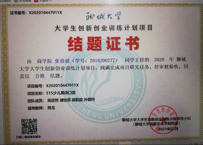 2021年7月,高欣然在2020年太阳成城集团大学生创新创业训练计划项目以合格结题,特此,对以上获奖同学予以祝贺表彰。