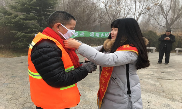 他们是城市的保卫者,迎来清晨的第一缕阳光,送走傍晚的最后一抹余晖,凛冽刺骨的寒风无情的刮伤他们的脸颊,商学院社会实践队发起给环卫工人送温暖的活动。社会实践队成员率先准备好口罩围巾等保暖用品,联系好附近环卫工人,安排好人员分工以及其所负责工作,以保证活动的顺利进行。环卫工人到场后,社会实践队成员亲自为他们分发物品,并且为他们佩戴口罩和围巾。双方亲切交谈,彼此交流心得体会,环卫工人表示对社会实践队的活动很感激欣慰。