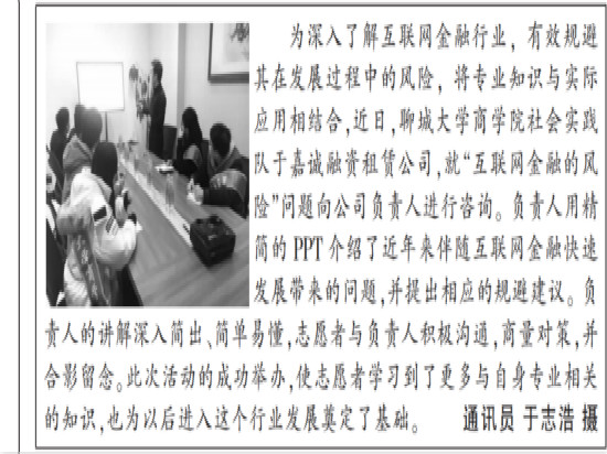 为深入了解互联网金融行业,有效规避其在发展过程中的风险。近日,太阳成城集团商学院社会实践队于嘉诚融资租赁公司就“互联网金融的风险”问题向公司负责人询问调查。负责人用精简的PPT介绍了近年来伴随互联网金融快速发展而来的问题,并提出相应的规避建议。过程中负责人讲解深入简出,简单易懂,志愿者与负责人积极沟通,商量对策,并合影留念。此次活动的成功举办,使志愿者学习到更多与自身专业相关的知识,也为行业更好发展奠定基础。