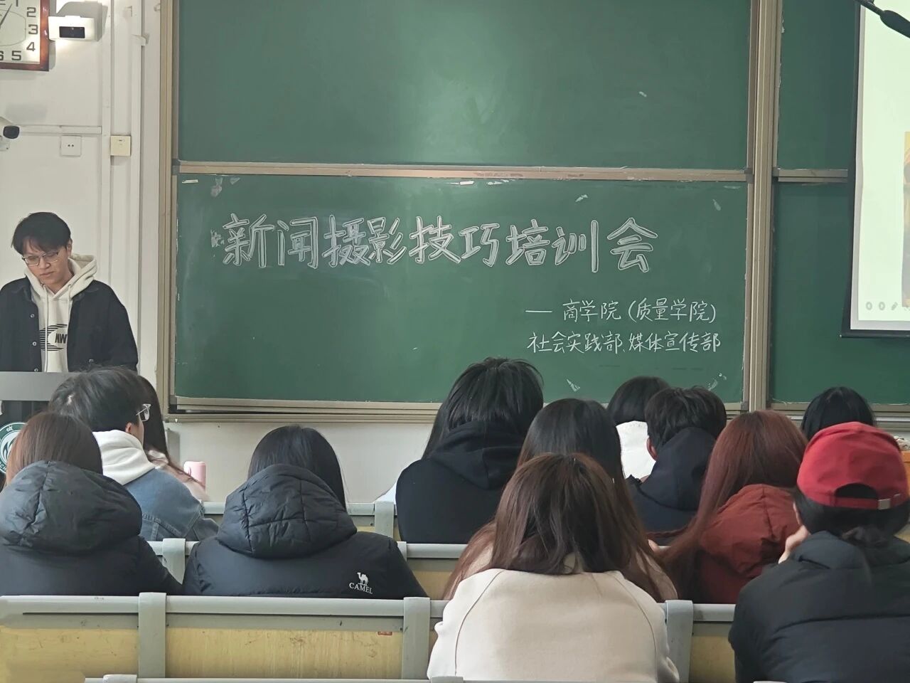 为提升社会实践活动宣传质量,3月16日,商学院(质量学院)于302室举办社会实践拍摄技巧培训会,学生会媒体宣传部孙浩恩担任主讲人,各班班团及学生会成员代表参训。