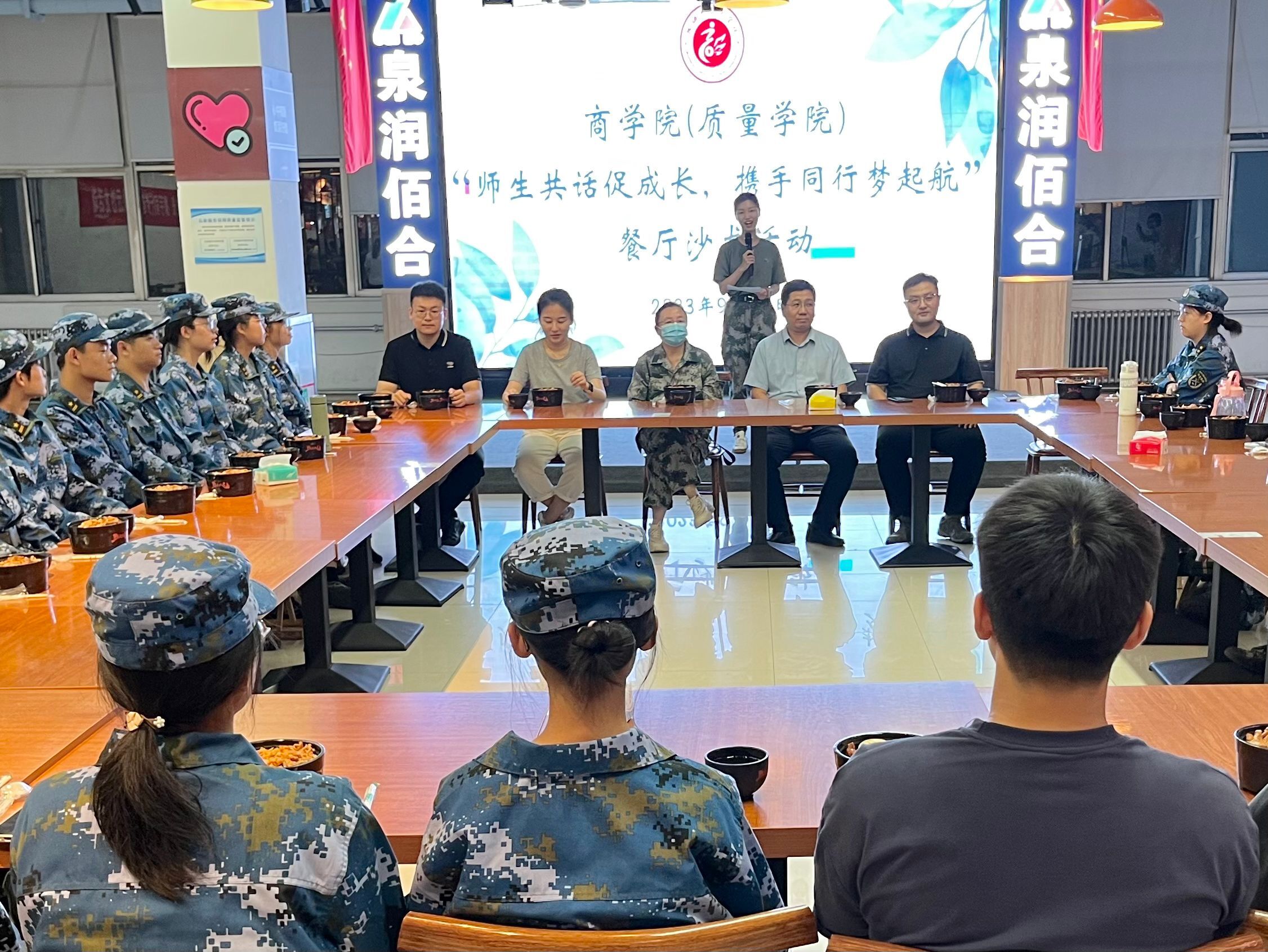 为帮助新生更好地适应身份转变,明确个人发展的目标与规划,以全新的精神面貌迎接新阶段、新开始。9月12日,商学院(质量学院)于东校区翰苑餐厅二楼开展“师生共话促成长 携手同行梦起航”餐厅沙龙活动。本次活动由辅导员施安琪担任主持人,学院团委书记刘玉华,辅导员张琼、高鹏、韩亭亭、王高平以及2023级新生代表参加。