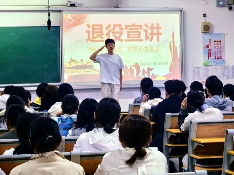 9月16日,学院于东校区1#209室组织开展国防故事分享会,2025级6班退役复学军人吴畅受邀结合自身在陆军“灭虎连”的服役经历,用通俗语言讲解国防知识,清晰阐述了国防与日常生活的紧密联系。通过对服役期间感人故事的讲述,吴畅生动展现了军人的坚韧意志与深厚战友情谊,并进一步深化了同学们对国防建设与军人职责的认知,有效激发了与会学生的国防意识与奋斗精神。