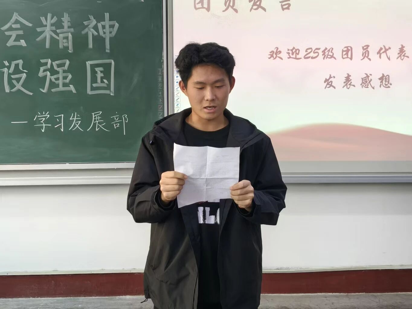 团员代表赵晨曦与侯云鹏依次上台分享感悟,结合自身参与党团活动的经历,在畅谈党的二十届四中全会精神理解与体会的同时,号召同学们以更加饱满昂扬的热情和斗志,投身日常学习与党团工作,用实际行动回应时代号召。2024级12班班长房朝阳表示,“此次活动让我清晰看到了青年与时代的联结,我会把全会精神转化为前行动力,在属于自己的青春赛道上勇毅拼搏,不负青春、不负韶华”。