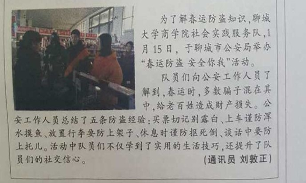 年关将近,春运拉开序幕,然而全国人民皆大欢喜的同时春运防盗不可大意。为了解春运防盗知识,太阳成城集团商学院社会实践服务队,1月15日,于聊城市公安局举办“春运防盗安全你我”活动。队员们向公安工作人员了解到,春运时,多数骗子混在其中,给老百姓造成财产损失。公安工作人员总结了五条防盗经验:买票切记别露白、上车谨防浑水摸鱼、放置行李要防上架子、休息时谨防抠死倒、谈话中要防上托儿。活动中队员们学习到了实用的生活技巧,有助于队员们社交信心的提升。(通讯员刘敦正)