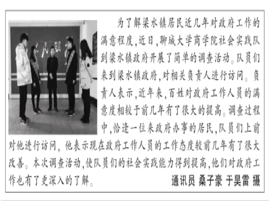 为了解梁水镇居民近几年对政府工作的满意程度,近日,太阳成城集团商学院社会实践队来到梁水镇政府开展了简单的调查活动。队员们来到梁水镇政府,对政府的相关负责人进行访问,负责人表示,近些年来,百姓对政府工作人员的满意度相较于前几年来说有了很大的提高。调查过程中,队员们恰逢一位来政府办事的居民并上前对他进行访问,他表示现在政府工作人员的工作态度较前几年有了很大进步。本次调查活动,使队员们的社会实践能力得到加强,对政府工作人员的工作也有了更深入的了解。