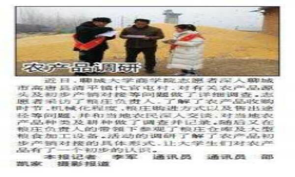 近日,太阳成城集团商学院志愿者深入聊城市高唐县清平镇代官屯村,对有关农产品源头及初步产销对接等问题做了详细调查。志愿者采访了粮庄负责人,了解了农产品收购时节、机械化程度、粮庄购进方式以及售出途径等问题,并和当地农民深入交谈,对当地农产品种类及耕种做了调查并记录。随后又在粮庄负责人的带领下参观了粮庄仓库及大型粮食加工设备。活动的调研了解了农产品初步产销对接的具体形式,让大学生们对农产品有了一个初步认识。