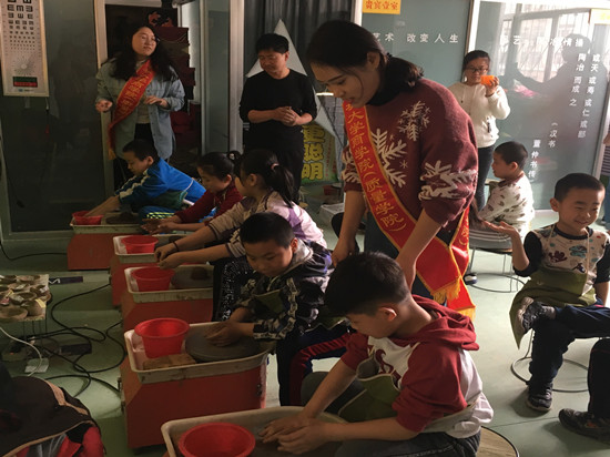 兴趣是最好的老师。小雏菊志愿者提前精心准备了一系列关于陶艺的趣味故事和悠久历史,用来吸引孩子们的注意力。陶艺老师也采用幽默诙谐的语言为孩子们讲述手工陶艺制作的详细要求和注意事项,孩子们都竖起机灵的耳朵认真仔细的倾听。活动人员分为两个小组,志愿者们协助陶艺老师带来陶土和工具,分发给第一组小朋友。孩子们拿着陶艺工具跃跃欲试,通过自己不停的摸索总结出了一套自己的方法,捏塑盘筑拉胚出了属于自己的精美工艺品。功夫不负有心人,短短一个小时的时间,一个个别出心裁独一无二的作品呈现在大家的面前。 孩子们通过这次活动,默契配合,亲身经历了制作陶艺的乐趣,溢出满满的成就感。精美绝伦的陶艺作品能启迪孩子去感受美、理解美和表现美,在陶艺活动学习中不断提高孩子的审美素质。(通讯员 于潇 杨同璐)