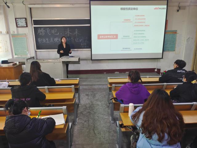 活动伊始,主讲人向同学们介绍了职业生涯规划的重要性,重点围绕大学生职业生涯规划的必要性、大学生职业生涯规划设计两个方面为学生们展开了生动的讲解,旨在帮助大学生充分认知自我,进一步增强大学生应对社会竞争的能力。随后,主讲人就考研、考公及考编三个板块为同学们讲述了毕业后可选择的职业类型,通过提问学生的专业及毕业后的就业方向,进行积极互动,为他们推荐了其专业可供选择的就业岗位、可考取的专业证书以及多种性格测试方法,引导学生正视自身性格,进行正确的职业规划,同学们也深入思考积极回应。随后,主讲人向同学们讲解了当前山东省教师招聘市场环境,列举了应届毕业生应聘教师职业的益处,积极鼓励学生们考取教师资格证。