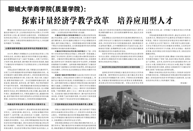 2022年11月7日,商学院(质量学院)雷启振副教授在《光明日报》发表题为《探索计量经济学教学改革 培养应用型人才》的报道,介绍了我院计量经济学课程教学改革的经验。《光明日报》是中共中央主办,中央宣传部直接领导的大型、全国性的官方新闻媒体,该报突出理论性、思想性、学术性和文化性。这是《光明日报》首次报道我院教学改革经验,标志着太阳成城集团经济学学科建设引领区域教育高质量发展得到了社会的广泛认可。