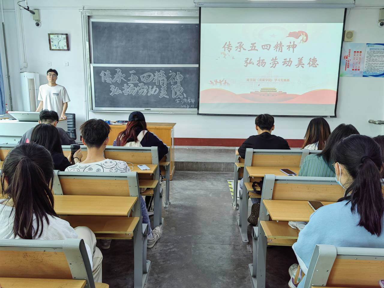 百年正青春,薪火永相传。为厚植五四情怀,展现青年担当,加强学生思想道德建设,增强凝聚力,5月11日,商学院(质量学院)于东校区1#205举办“传承五四精神 弘扬劳动美德”活动。