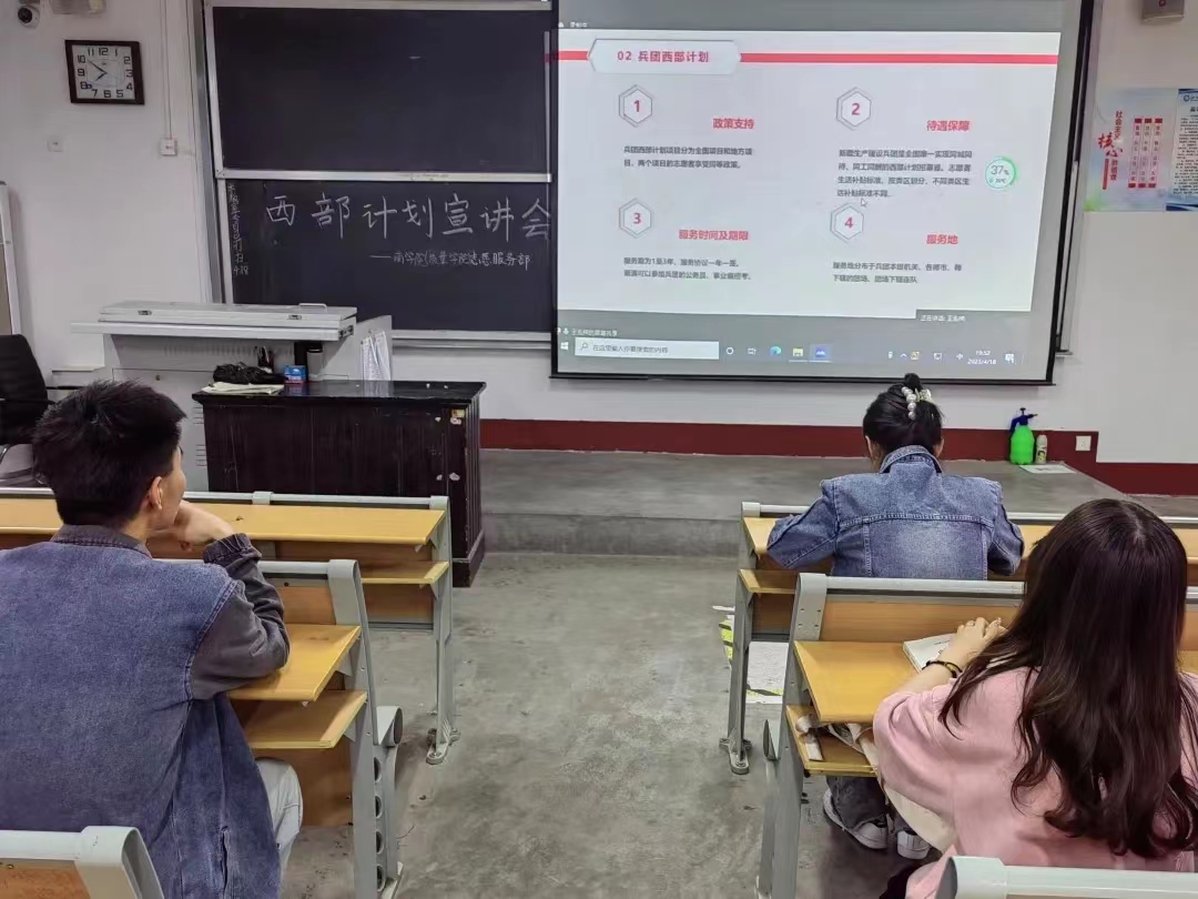 为进一步宣传大学生志愿服务西部计划项目,激发应届毕业生投身志愿服务的热情,引导和鼓励青年学子到西部扎根基层、投身实践,4月18日,商学院(质量学院)于东校区1#517举办西部计划宣讲活动。部分应届毕业生和部分2021级、2022级学生参加了此次活动。