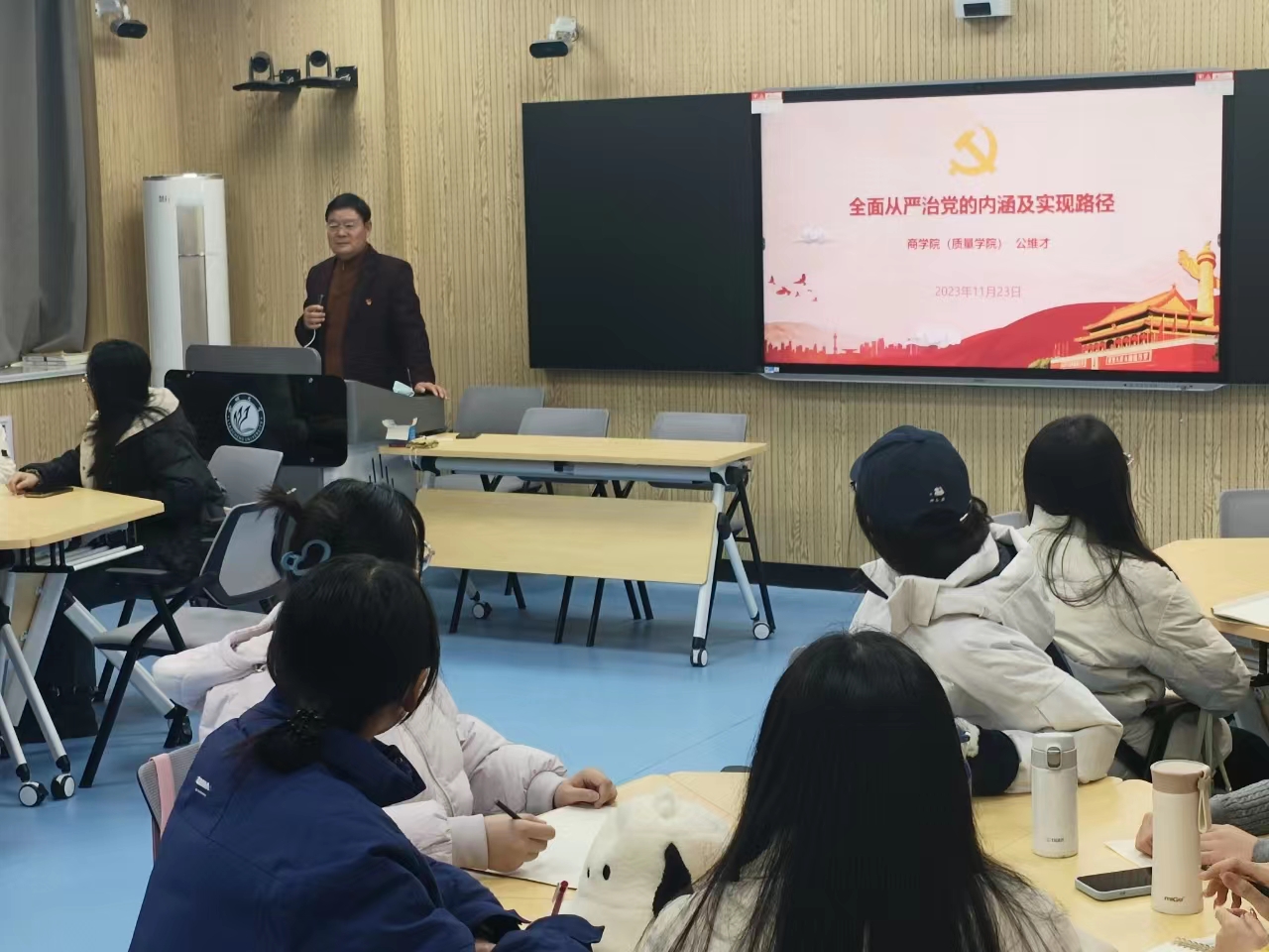 为加强对学生的思想政治教育,使其永葆初心使命,11月23日下午商学院(质量学院)党委书记公维才为2023级会计硕士研究生作了《全面从严治党的内涵及实现路径》的廉政课堂教育报告。报告内容包括什么是全面从严治党、为什么要全面从严治党和怎样全面从严治党三个方面。具体而言,全面从严治党的内涵可分解为全面——管全党、治全党,从严——要求从严、措施从严、查处从严,治党——建党与治病的辩证统一、让全面从严治党成为新常态。之所以要全面从严治党是由于世情的变化——百年未有之大变局,国情的变化——社会主要矛盾的调整,党情的变化——执政环境的转变、党的管理的需要等。为此全面从严治党需要坚持以党的政治建设为统领,坚决维护党中央权威和集中统一领导;强化思想建党,筑牢“从严治党”信仰根基;严格选人用人,夯实“从严治党”人才保障等九个方面展开。