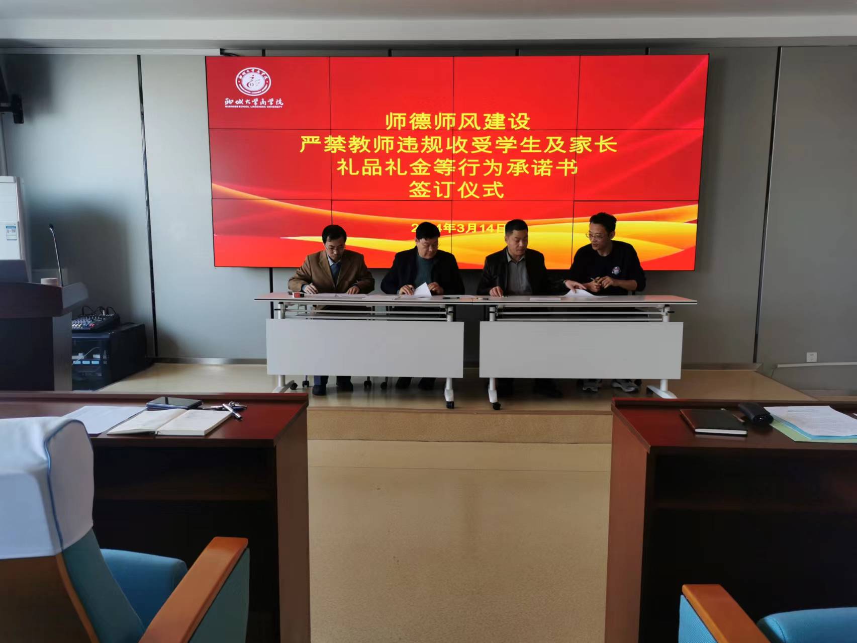 会上,学院党政主要负责人公维才和杨宏力与各系主任、科级干部签订了《校园安全稳定责任书》,全体教职工在责任书上背书;同时,学院每位教师签订了《商学院(质量学院)2024年度师德师风建设承诺书》《商学院(质量学院)2024年度严禁教师违规收受学生及家长礼品礼金等行为承诺书》。