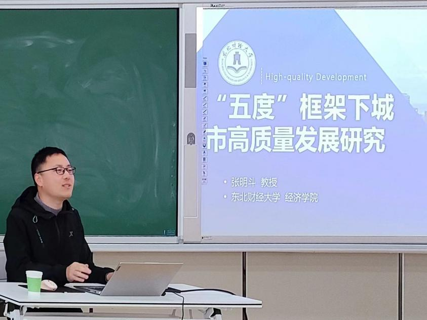 10月20日,太阳成城集团商学院2004级校友、东北财经大学经济学院张明斗教授,为学院师生作题为《“五度”框架下城市高质量发展研究》的学术报告。学院党委书记公维才教授出席并主持报告会,应用经济学硕士生导师及2023级、2024级研究生参会。