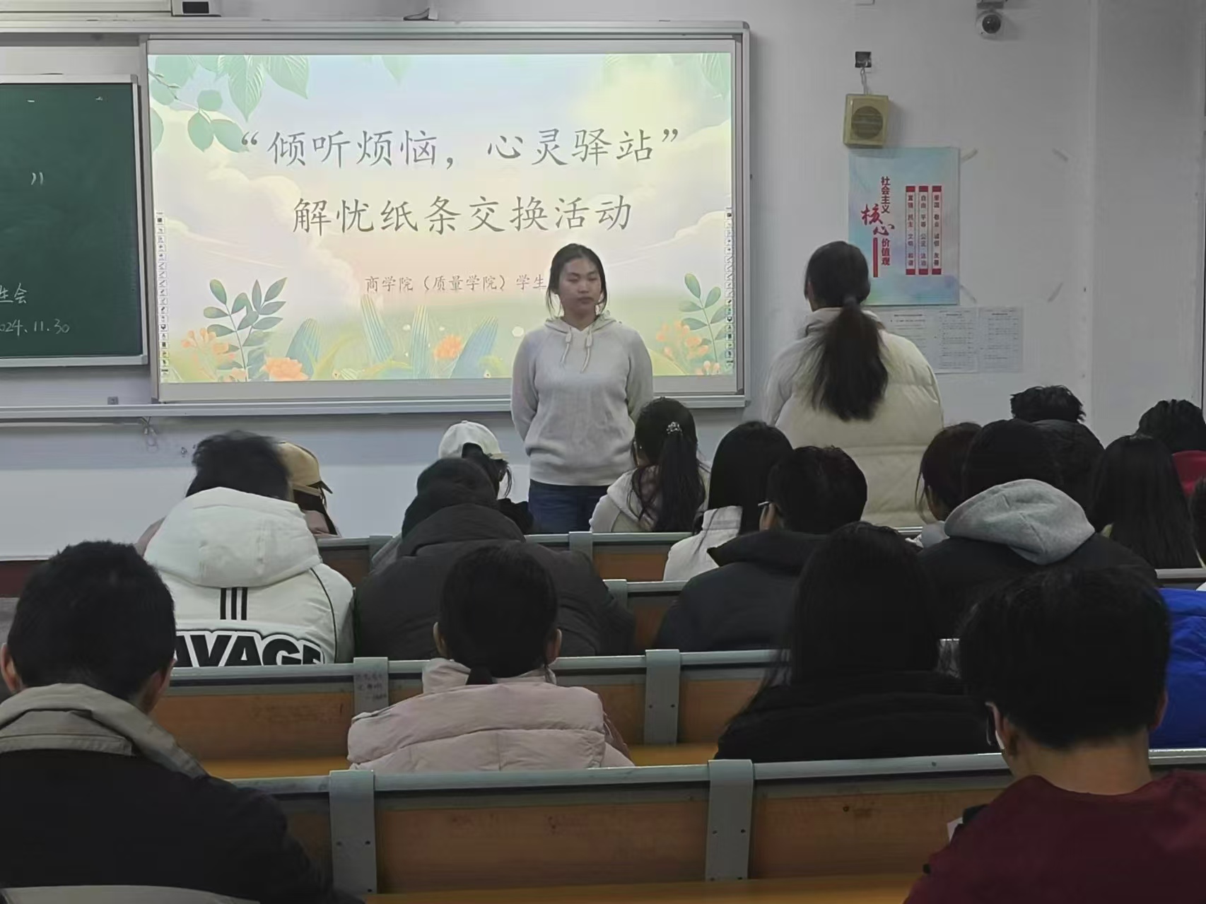 为给学院学子提供一个安全、私密且充满关爱的倾诉平台,帮助其释放内心情感,11月30日,商学院(质量学院)于东校区1#314举办“倾听烦恼 心灵驿站”解忧纸条交换活动,学院学生会档案部副部长王毓新担任主持人,2024级60位学生代表参加活动。