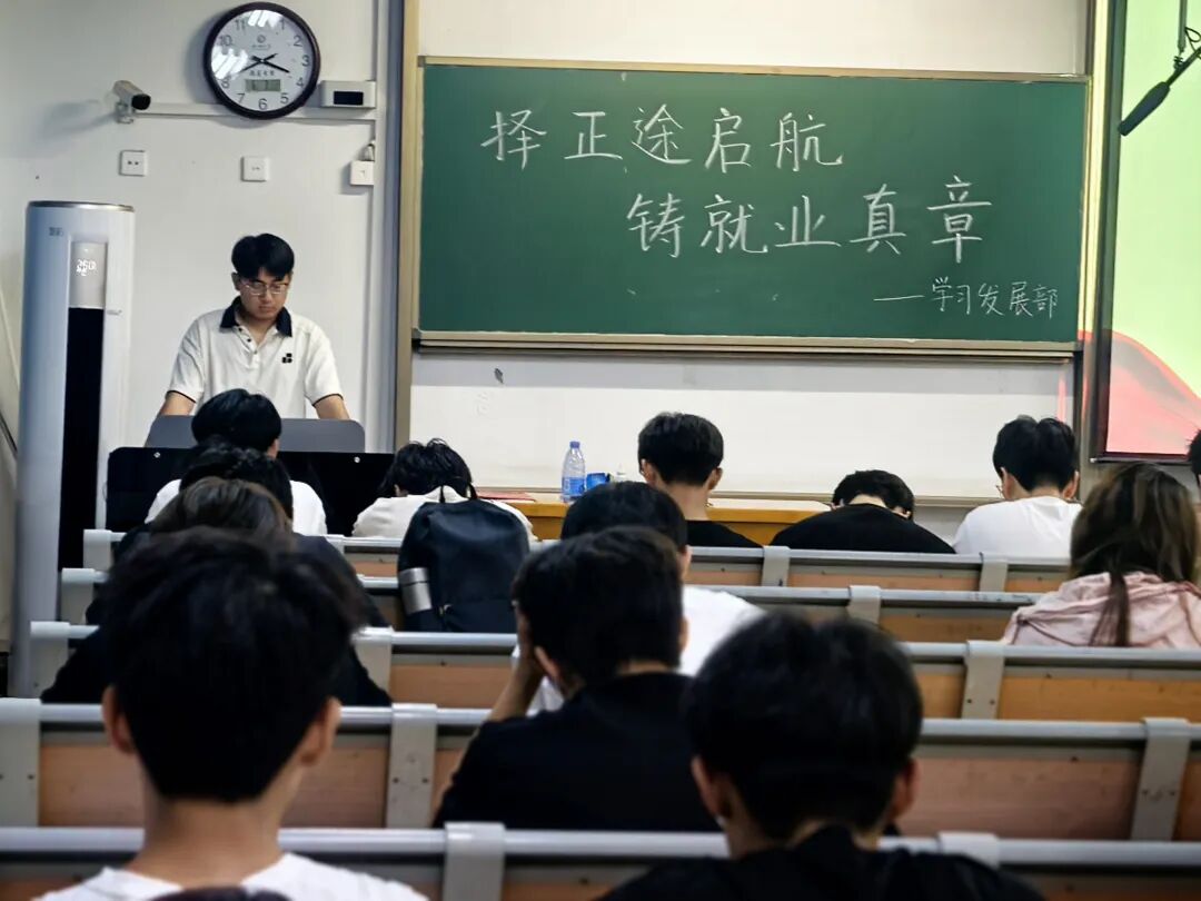 为引导同学们树立正确就业观,将个人理想与国家发展相结合,6月3日, suncitygroup太阳成集团于东校区1#214组织开展“择正途启航铸就业真章”主题团日活动,学院学生会学习发展部干事孔鑫瞳担任主讲人,2022至2024级各班班团参加。