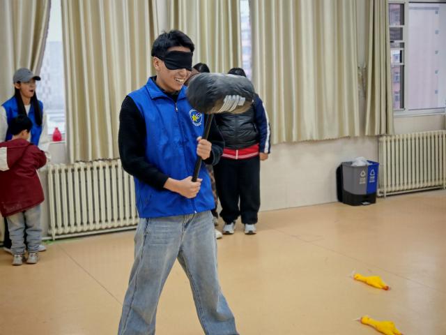 活动现场分为视障体验组与听障绘画组同步开展。蒙眼抓人环节里,志愿者们戴上眼罩,在视障学子的引导下参与躲避抓捕游戏,沉浸式体验视障群体的感知世界,被捕获的小组共同带来唱歌、诗朗诵等才艺展示,欢笑声与掌声在活动区不断响起。无声绘画环节中,听障学子围坐画布旁,用油画棒自由描绘“心中的美好世界”,志愿者仅提供必要协助,并用手势、文字与学生交流创作想法,记录下一幅幅作品背后的故事。在此基础上,志愿者积极与学校教师复盘交流,梳理学生需求,为后续团队完善个性化服务档案,与特校搭建长期志愿服务对接机制奠定基础,进而持续关怀关爱残障学子。