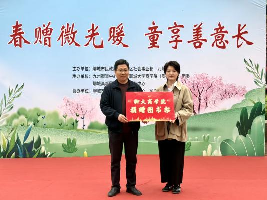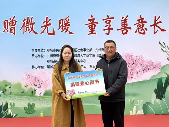 我院团委书记刘玉华向高新区社会事业部副部长蔡志儒移交爱心物资;聊城高新区聚爱志愿服务中心理事长苏金生向高新区九州街道党建办主任李莹莹捐赠书籍,以书香浸润童心,助力流动儿童成长发展。